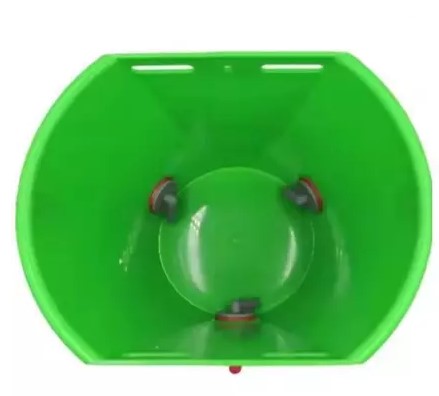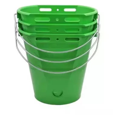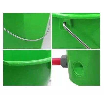 * Dilengkapi Gantungan: Memiliki pegangan kawat yang kuat untuk digantung di kandang atau pagar, menjaga ember tetap stabil saat digunakan.