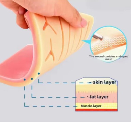 Beragam Jenis Luka: Dilengkapi dengan berbagai macam sayatan dan luka (pendek, panjang, melengkung, berbentuk "Y," dll.) untuk melatih berbagai jenis jahitan dan penutupan luka. Ideal untuk melatih teknik jahitan sederhana (simple interrupted), matras horizontal, matras vertikal, dan lainnya.