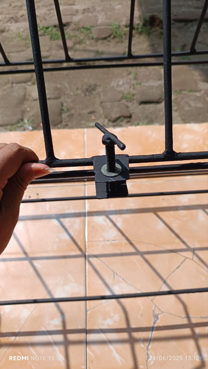 Bahan besi, warna hitam. Ada kunci.