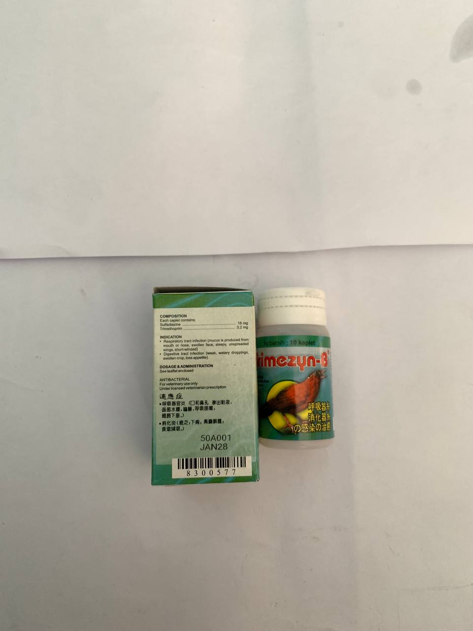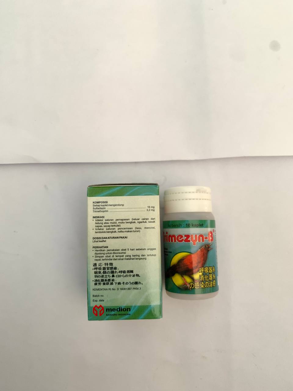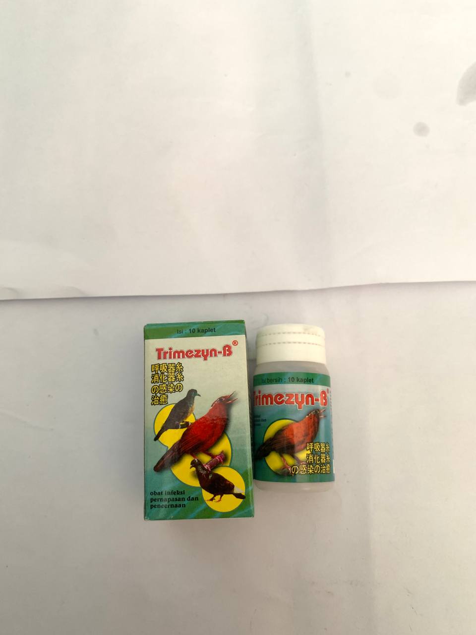 TRIMEZYN-B merupakan sediaan berbentuk kaplet untuk mengobati infeksi saluran pernapasan dan pencernaan pada burung kecil maupun besar. TRIMEZYN-B bekerja secara sinergis untuk menghambat sintesa (pembentukan) protein bakteri sehingga bakteri tidak dapat berkembang dan burung yang terinfeksi menjadi cepat sembuh.